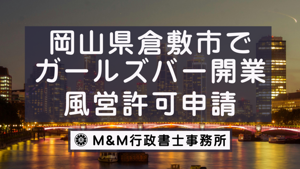 こちらのページでは岡山県倉敷市でガールズバーの開業をしたい(風俗営業許可・風営法許可申請をしたい)をお考えの方向けに風営法許可申請に必要な書類・料金・流れ・ご依頼方法について解説しています。 ご依頼はこちらから -