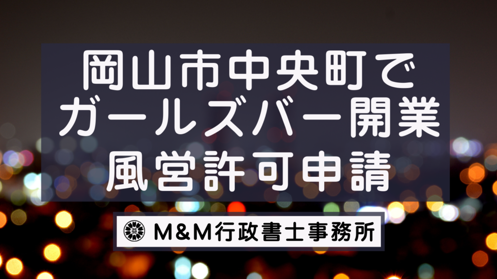 こちらのページでは岡山市中央町でガールズバーの開業をしたい(風俗営業許可・風営法許可申請をしたい)をお考えの方向けに風営法許可申請に必要な書類・料金・流れ・ご依頼方法について解説しています。 ご依頼はこちらから -