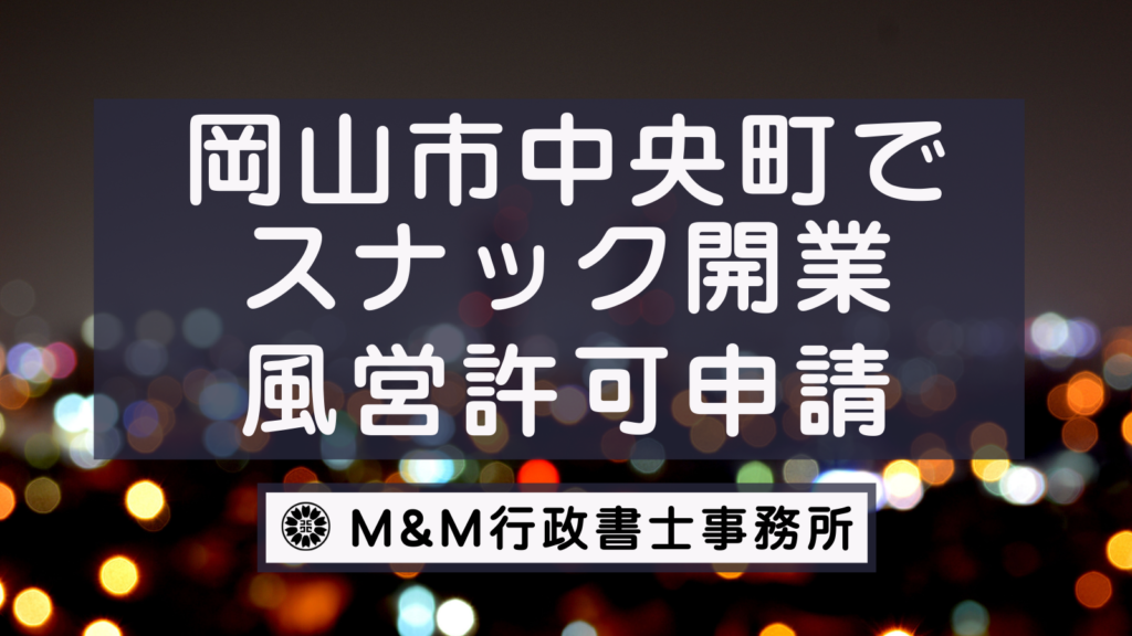 こちらのページでは岡山市中央町でスナックの開業をしたい(風俗営業許可・風営法許可申請をしたい)をお考えの方向けに風営法許可申請に必要な書類・料金・流れ・ご依頼方法について解説しています。 ご依頼はこちらから -